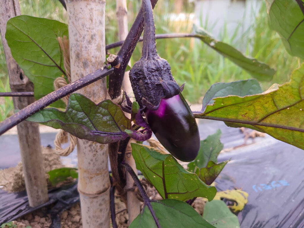 ちなみに、マルチシート(黒いビニール)は土壌の乾燥防止と雑草抑制のために敷いています。ただ、黒色なので高温になりすぎるために草刈りで出た枯れ草をマルチの上に被せています。